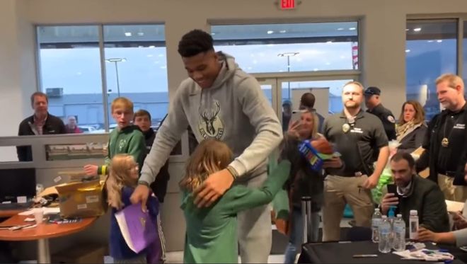 在雄鹿的一场签名会现场,一个小女孩将球衣递给了字母哥,随后将自己亲手画的画册送给了自己的偶像,字母哥也是立马起身拥抱了小女孩,还一页一页的看了小女孩的画册。