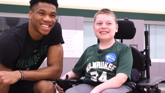 雄鹿官方邀请了小男孩到雄鹿训练馆,字母哥也是为小男孩送上了自己的签名球衣,随后还召集了队友们聚在一起让小男孩喊口号。